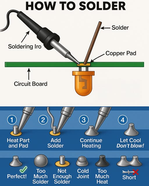 У меня всегда для пайки таких выводных компонентов на жале есть припой. Это быстрее прогревает места спайки, можно подавать прутком припоя припой. Но я просто «большой каплей припоя» паяю. И всегда много флюса (он никогда не бывает лишним).