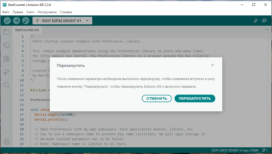 Жму отменить, в этом окне ничего не меняется, открываю новый файл, а там пункты меню Файл, Правка Скетч, Инструменты, Справка переместились в верхний правый угол как на картинке ниже.