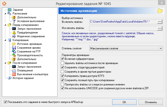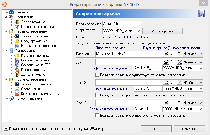 В эту программу вводится набор заданий. В задании прописываются: источник архивации, сохранение ZIP-архива и многое - многое другое. Архив можно сохранять в три места, можно задать шаблон имени архива так, чтобы в имени архива прописывалать дата создания, можно задавать цепочку заданий. В архиве хранятся пути архивируемых файлов.