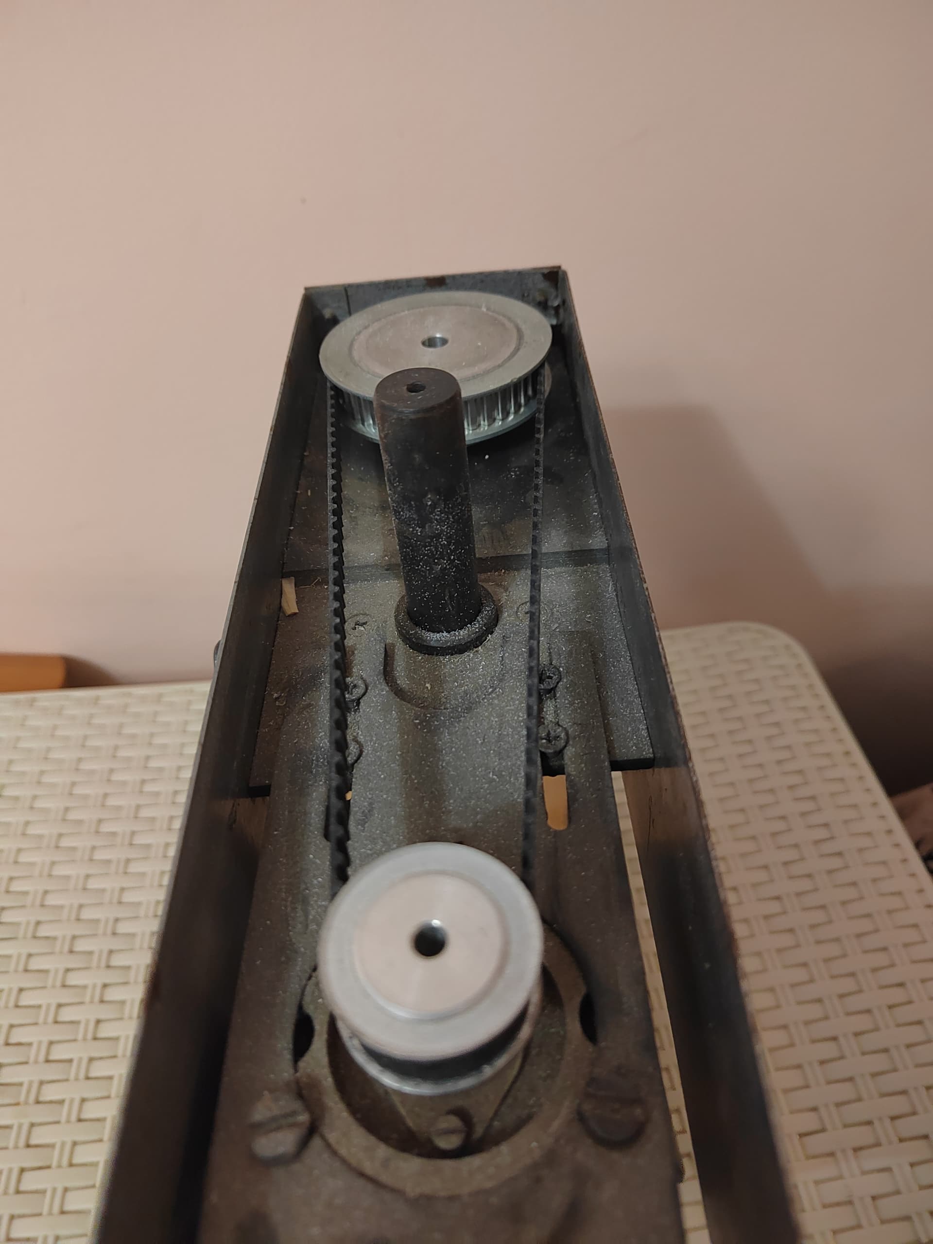Заменил шкивы, переставляя ремень на которых можно было изменять скорость вращения патрона, на шкивы и ремень что на фото. Тут да, новые ремень и шкивы с Али.