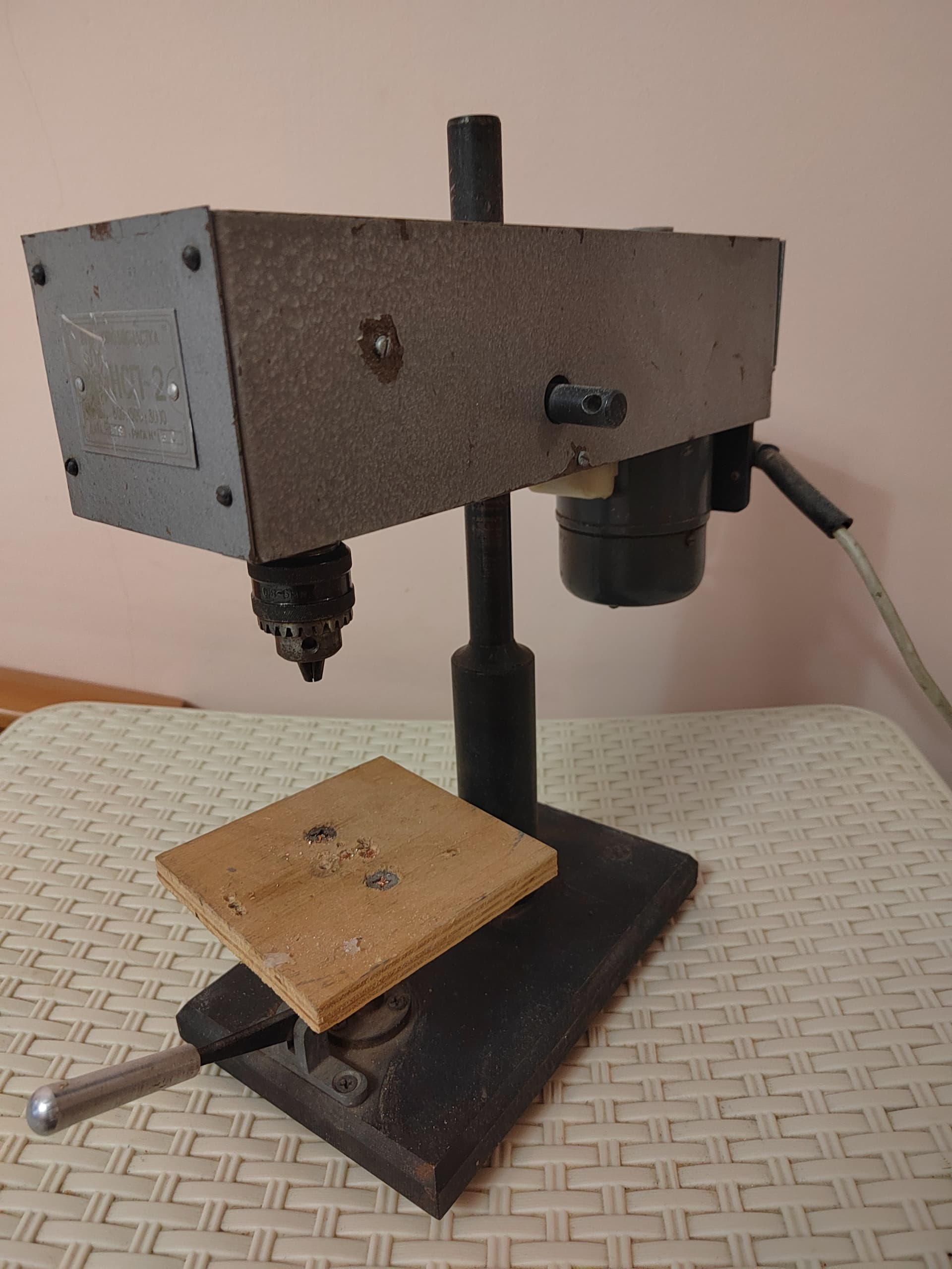 Делал в 80х из старого школьного (вроде бы, точно не помню) микроскопа. Двигатель ДПМ, цанговый патрон. При переезде потерялся где-то. Сейчас сверлю вручную, но мысли есть сделать (хотя и не сил но нужно, перешел на smd).