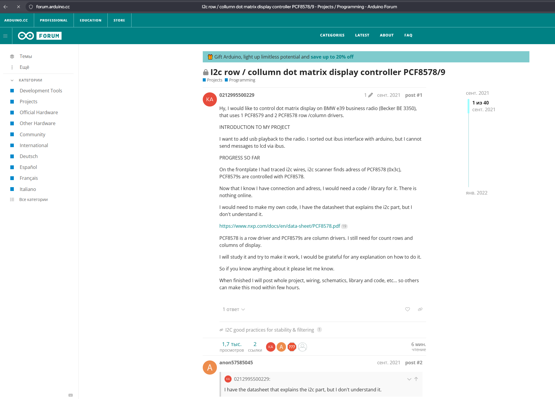 Всем доброго дня. Попался интересный светодиодный пиксельный дисплей на комплекте микросхем PCF8578 и PCF8579. Есть сведения какие-то по управлению таким дисплеем? Нашел тему : I2c row / collumn dot matrix display controller PCF8578/9 - Programming - Arduino Forum , там человек разбирался как раз с таким дисплеем и запустил его, но увы- не открывается, может тема умерла или заблокирован доступ. В общем, буду признателен, если поделитесь информацией