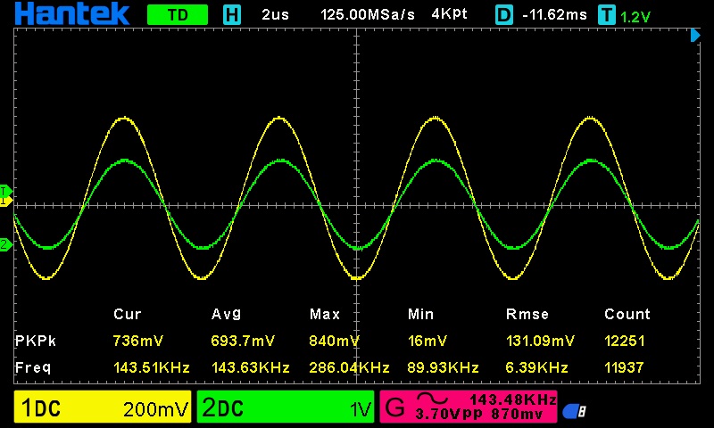 уменьшил резистор до 1 Ома, взял другую катушку, с конденсатором 3300 резонирует на 126 килогерц, на резисторе 100 милливольт, ток 100ма выходит при входном 2 вольта