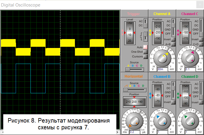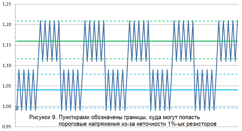 В строках №№ 11-15 заданы наши три резистора и pull-up резистор. В строке №21 считается верхний порог переключения, а в строке №22 – нижний. В результате имеем: верхний порог, при любом, даже самом неудачном, раскладе с номиналами резисторов, будет находиться между 1,116 В и 1,209 В, а нижний – между 0,996 В и 1,079 В. Нанесём эти границы пунктирными линиями соответствующих цветов на наш сигнал: