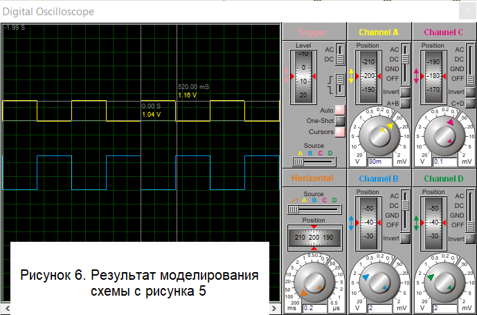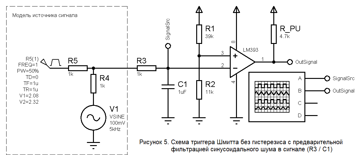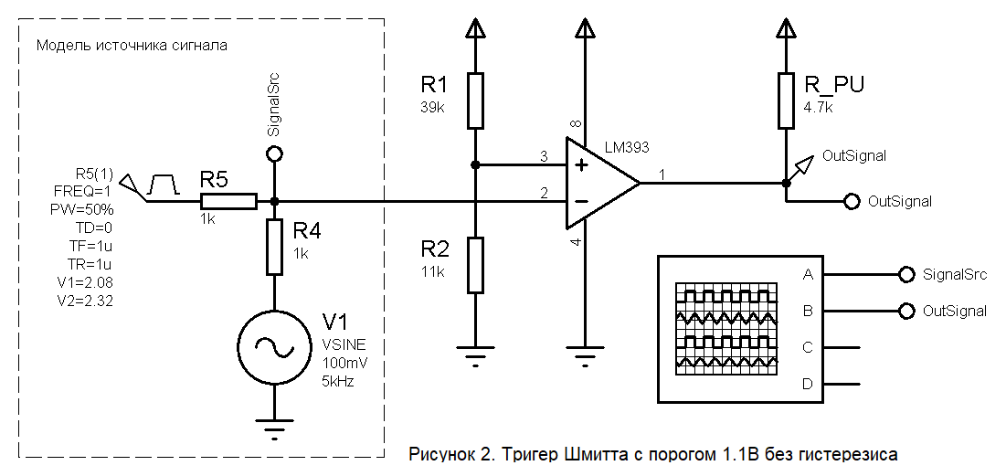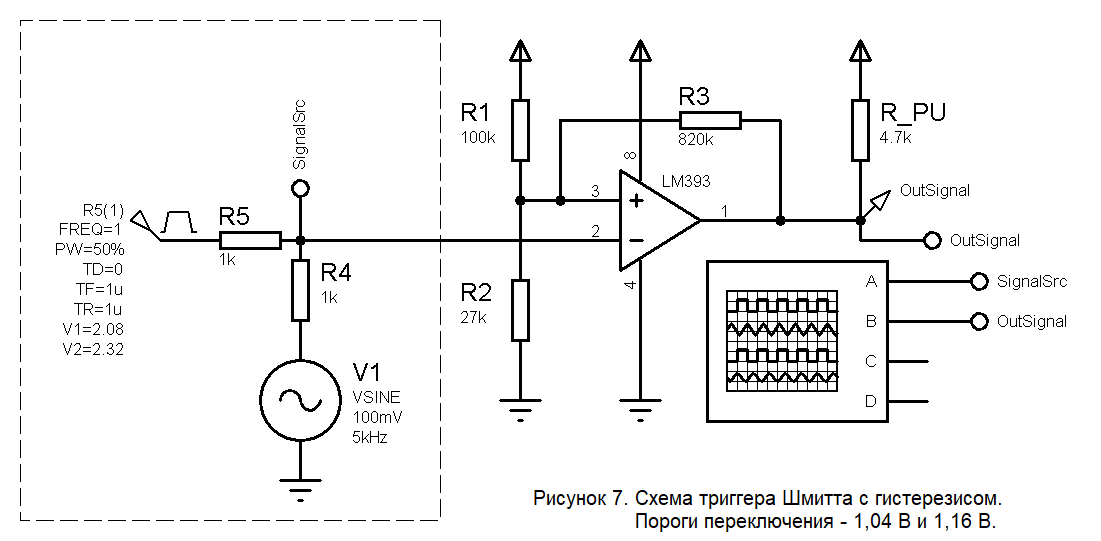 Другое решение – это сделать триггер с гистерезисом, выбрав, в качестве порогов переключения, средние линии нашего сигнала (1,04 В и 1,16 В). Для этого достаточно добавить в схему с рис. 2 один резистор и всё пересчитать. Получается вот такая схема.