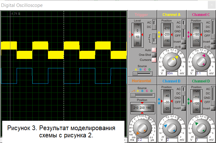Т.е., если нам не повезёт, то напряжение может “залезть” на шум и наш триггер будет переключаться как сумасшедший. Кстати, мне повезло и схема с рис. 2 заработала у меня в железе с первого раза. Но могло и не повезти – пришлось бы долго и нудно подбирать экземпляры резисторов. Лучше избегать таких схем.