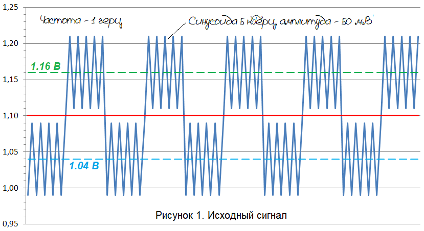 Итак, возникла вот такая задача. В готовом устройстве имеется сигнал (меандр) частотой около 1 Герца. Верхнее напряжение 1,16 В, нижнее 1,04 В. Сигнал сильно зашумлён, но шум, слава Богу, регулярный – просто прёт синусоида с частотой 5 кГц и амплитудой 50 мВ. Вот такой, примерно, сигнал: