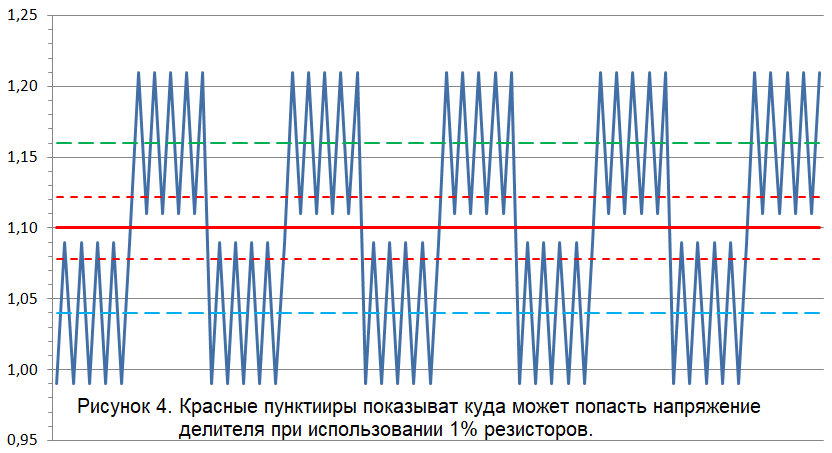 В строках №№ 8 и 9 заданы резисторы, а в строке №14 до боли знакомая формула делителя напряжения. Результат приведён в комментарии. Как видите, имеем разброс от средней точки 1,1 В на ±22 милливольта, т.е. при однопроцентных резисторах, напряжение у нас может получиться от 1,078 В до 1,122 В – как повезёт. Нанесём эти границы на рисунок сигнала (красные пунктирные линии):