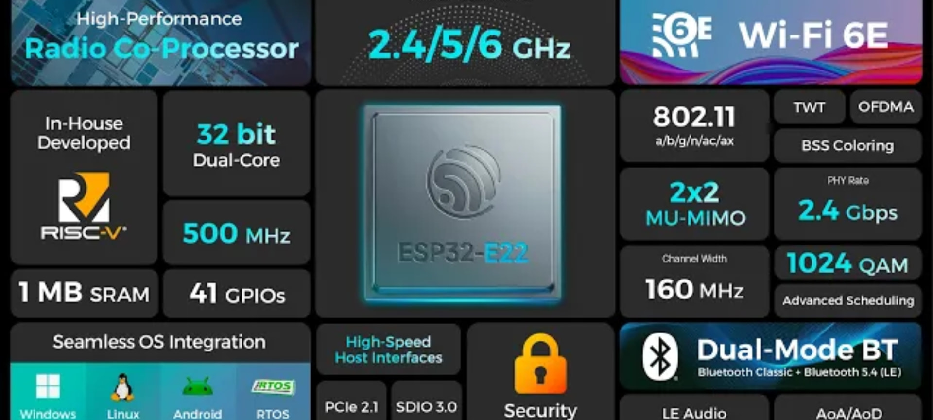 ESP32-E22 is Espressif’s first tri-band Wi-Fi 6E connectivity co-processor, designed for host-based wireless systems operating across the 2.4 GHz, 5 GHz, and 6 GHz bands. Based on Espressif’s self-developed dual-core RISC-V platform and in-house Wi-Fi 6E stack, ESP32-E22 provides a stable, scalable connectivity foundation for next-generation products.