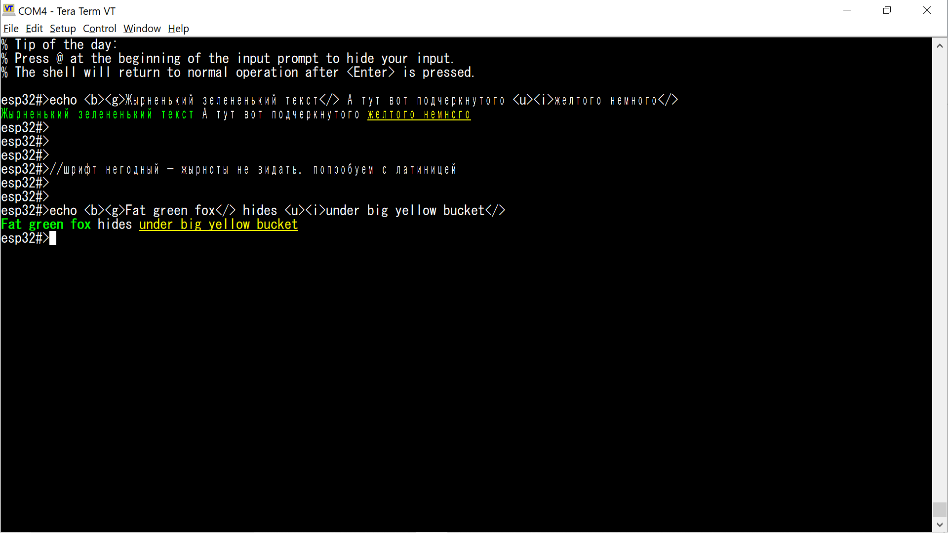 echo <b><g>Fat green fox</> hides <u><i>under big yellow bucket</>