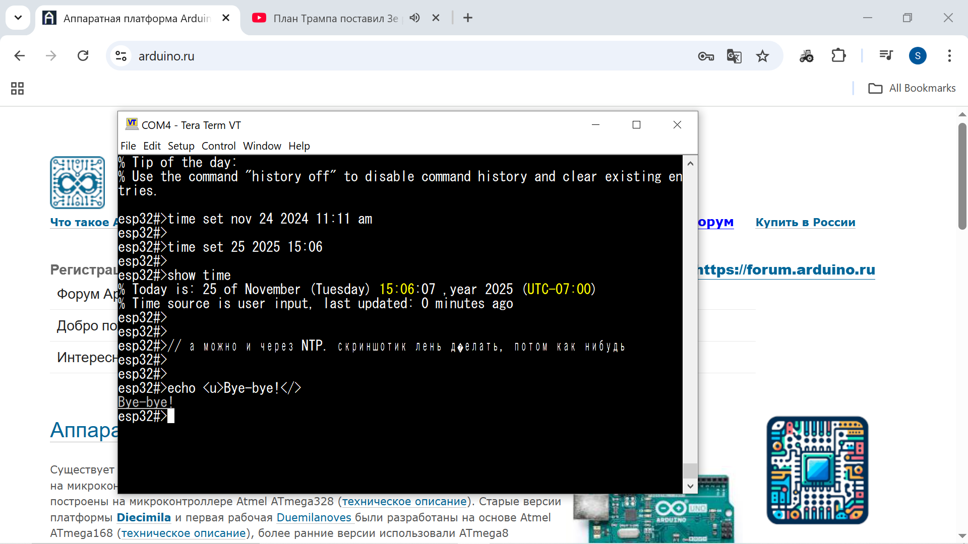 Время запилил. Теперь у нас, как у взрослых, системное время есть, часовой пояс. Был удивлен тем фактом, что часы не сбрасываются на ЕСП32 пока подается питание. Ни резеты ни sleep никак на часы не влияет. Однако часового пояса он не понимает и не сохраняет. Пришлось допилить этот момент и сохранять TZ во флеш. Время можно устанавливать вручную, а можно - по сети, по NTP