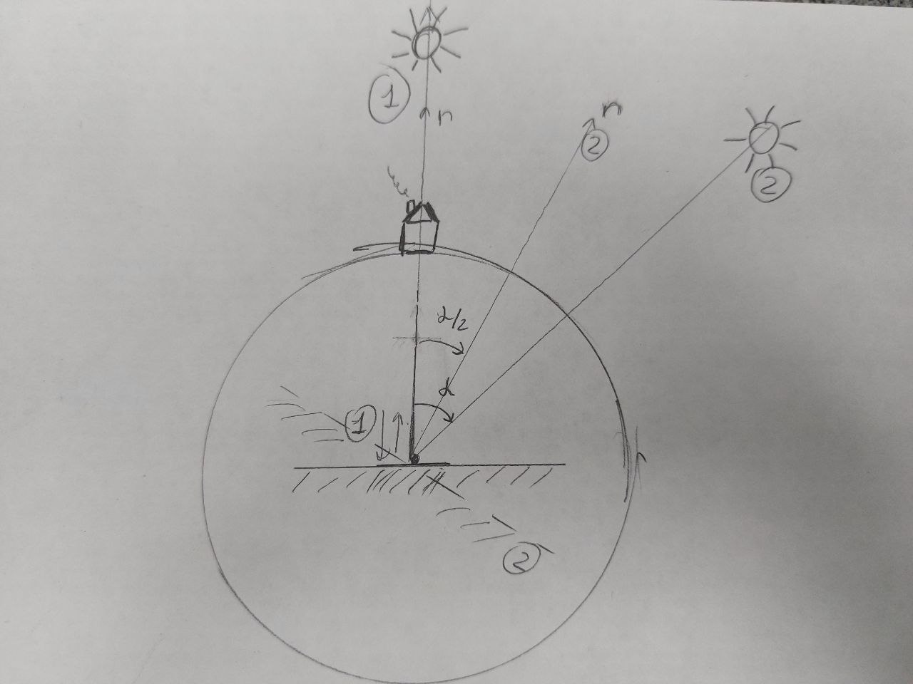 Домик стоит на полянке (круг), в центре зеркало. n - нормаль зеркала. При проходе солнца из положения 1 в 2 на угол альфа зеркало доворачивается на альфа/2. Т.е. горизонтальная ось поворотной платформы всегда направлена по биссектриссе угла солнце-зеркало-дом.