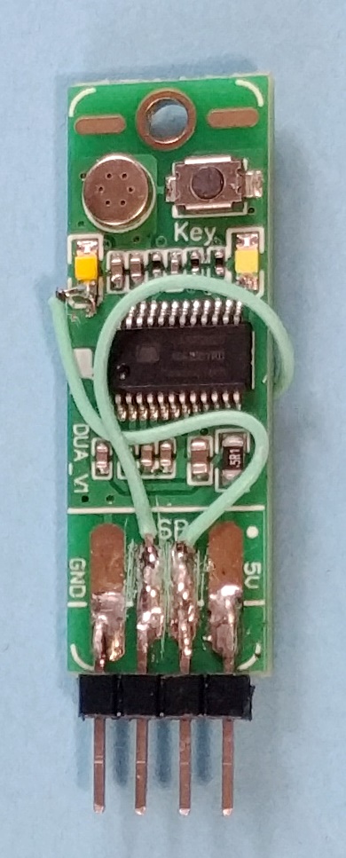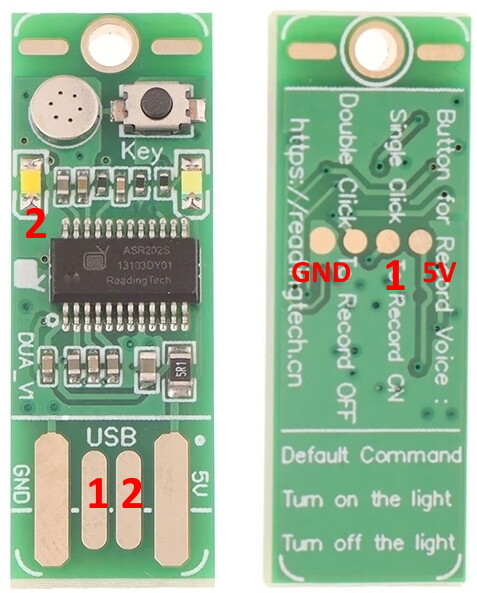 Нет. Модуль по задумке изготовителя автономен, голосовой ночник на два, как оказалось в реальности, состояния вкл.-выкл. Я преобразовал в модуль на произвольное число команд, сочетание двоичных нольодинодинодинноль…В принципе трёхсловные в голове должны держаться, несмотря на возраст, т.е. 8 команд. Можно усложнить анализ фразы, типа ноль это 000, а один это 100. Ну и далее по усложняющейся ![]()