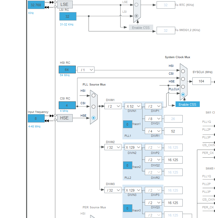 могу ошибаться , но в старых версиях CubeMx , выбор Bypass/Ceramic resonator/ None , в отображении Clock Tree мог не меняться