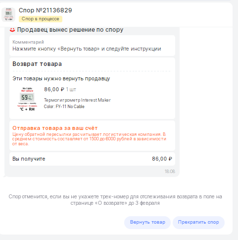 Продавец ошибся с товаром, вместо термогигрометра выслал просто термометр (товар стоил 86 рублей) в таком же корпусе. Теперь мне предлагает вернуть его товар за доставку которого просит оплатить от 1500 рублей до 6000 рублей. Далее выслать ему трек номер. Только тогда он вернёт деньги, когда получит свой товар. А главное, что предлагается либо отменить спор, либо вернуть товар сообщив трек. Это что за беспредел то творится на али? Первый раз такое за более 30 лет покупок у китайцев.