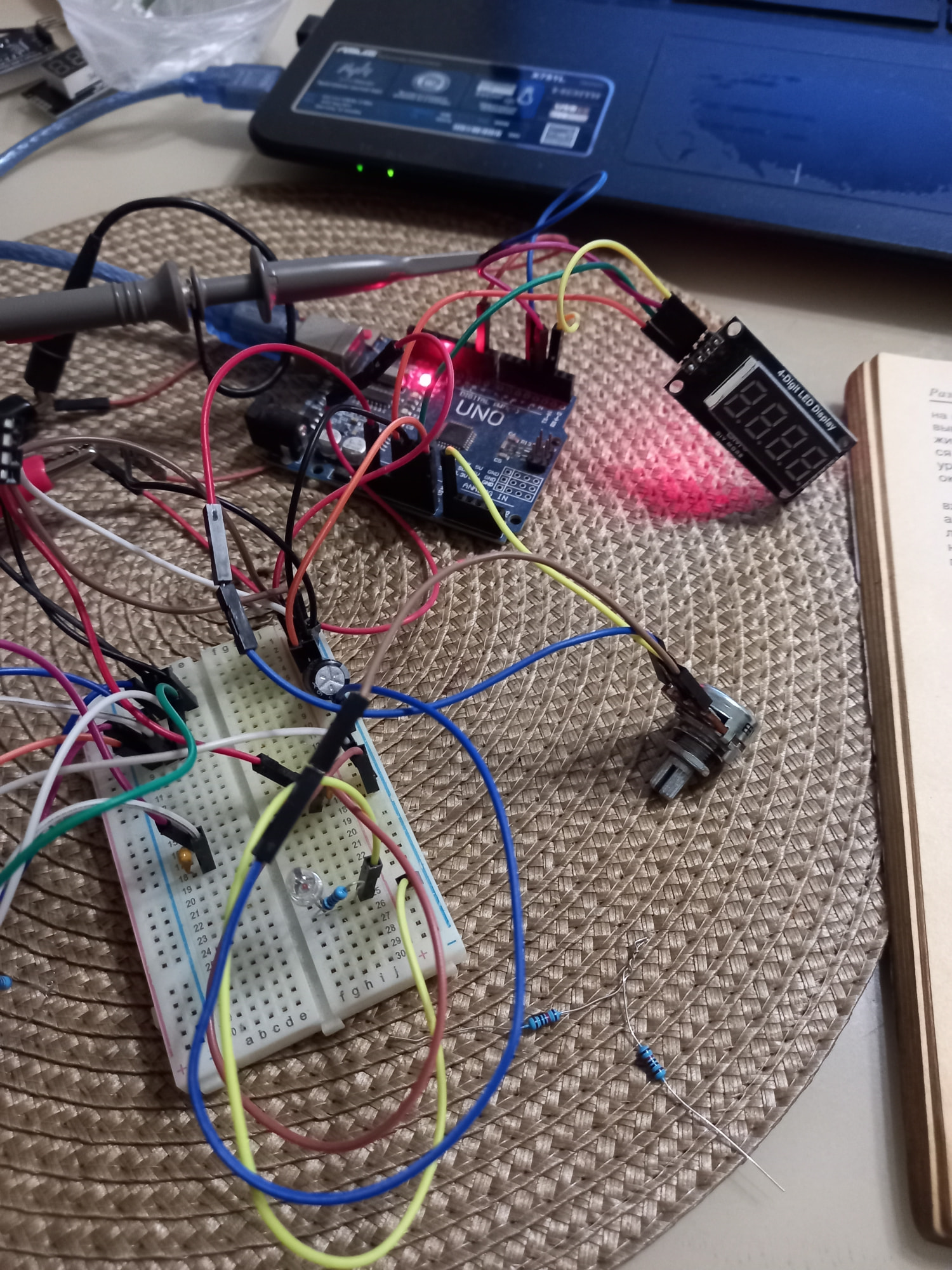 Как писал выше: импульсы с 9-го вывода ардуино идут на 4-й. С помощью потенциометра меняется частота. Стрелка спидометра(ваз 2115) отклоняется. Но вот отображения скорости нет на 7-ми сегментном индикаторе. Не пойму подсчет импульсов неправильно сделан или вывод на индикацию. Подскажите, что не так .