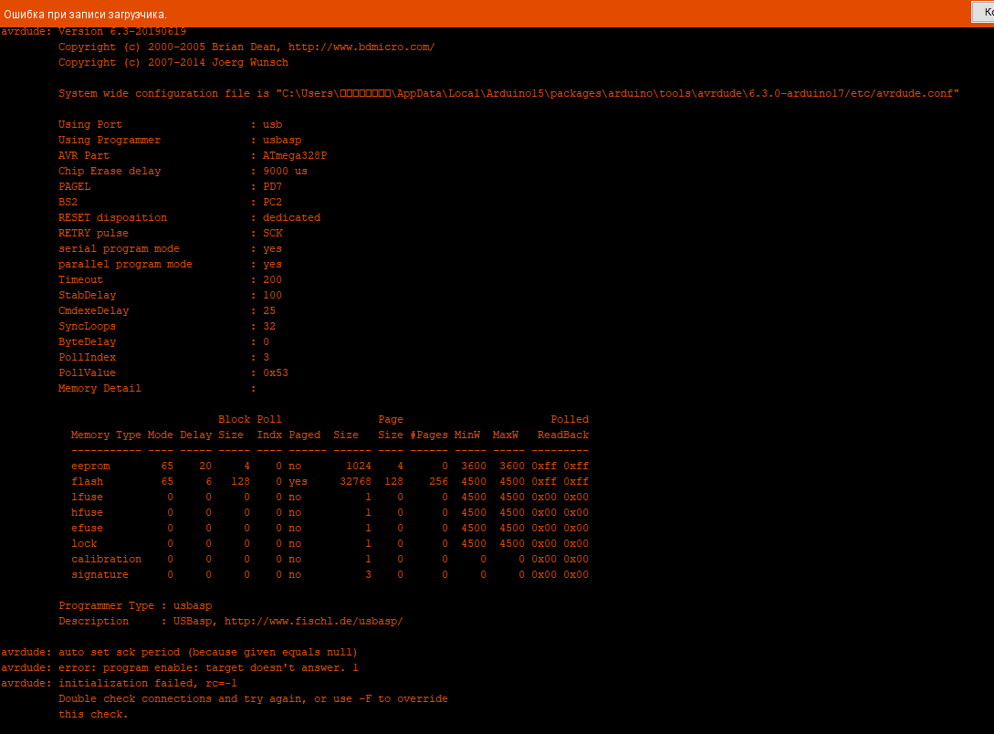 предыдущие попытки с USBtiny, после начала записи загрузчика, привели к окаменению чипа, после того как выпали ошибки. дую на воду уже