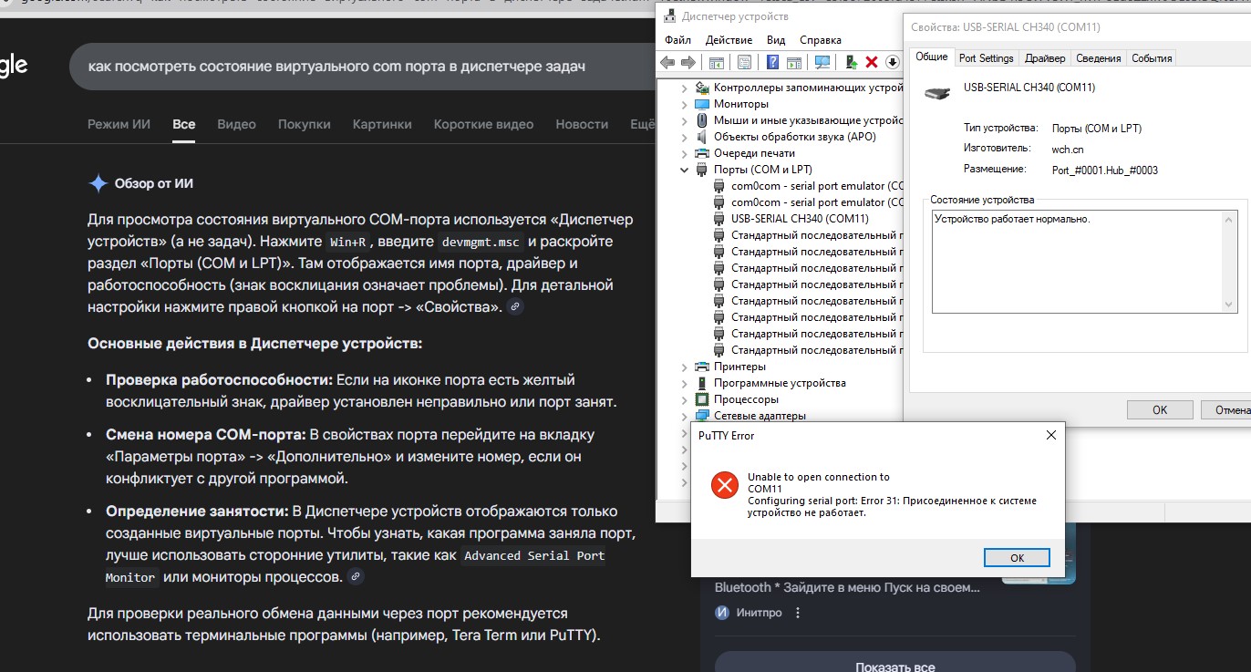 Я просил состояние порта в диспетчере задач посмотреть перед этим. Что пишет о состоянии устройства?