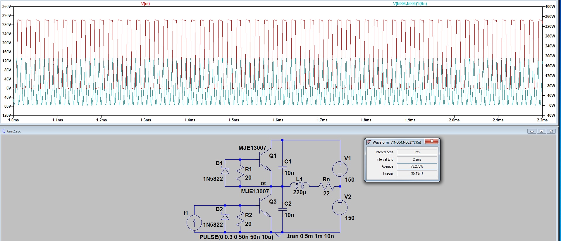 Запускаем коротким импульсом от источника тока и смотрим, как все работает. В выноске показана мощность в нагрузке, 80 Вт.