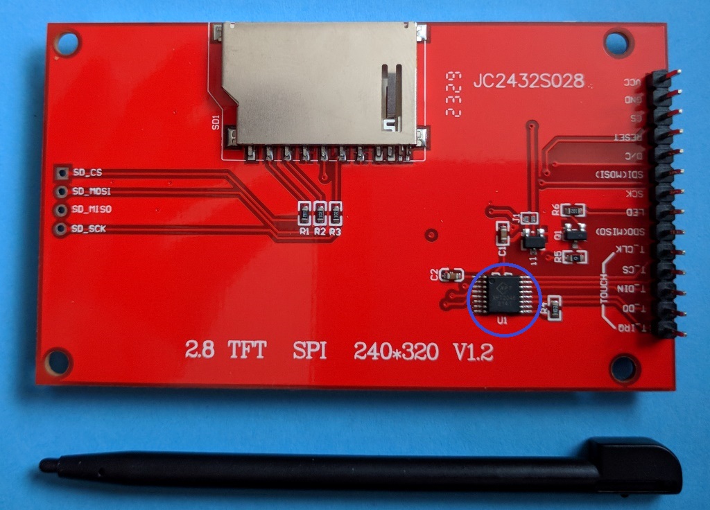 Эта микросхема управления сенсорным дисплеем данного модуля. Вся своя память дисплея это его озу кадра. Объём считаем как 240х320х18 бит.