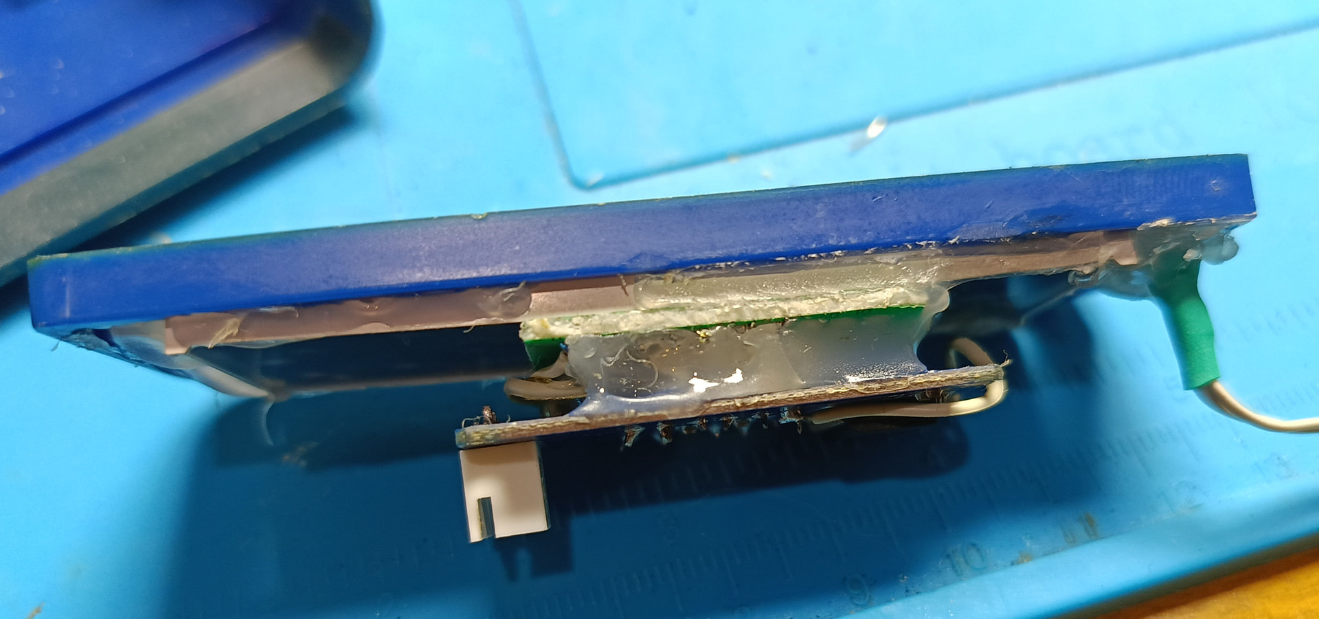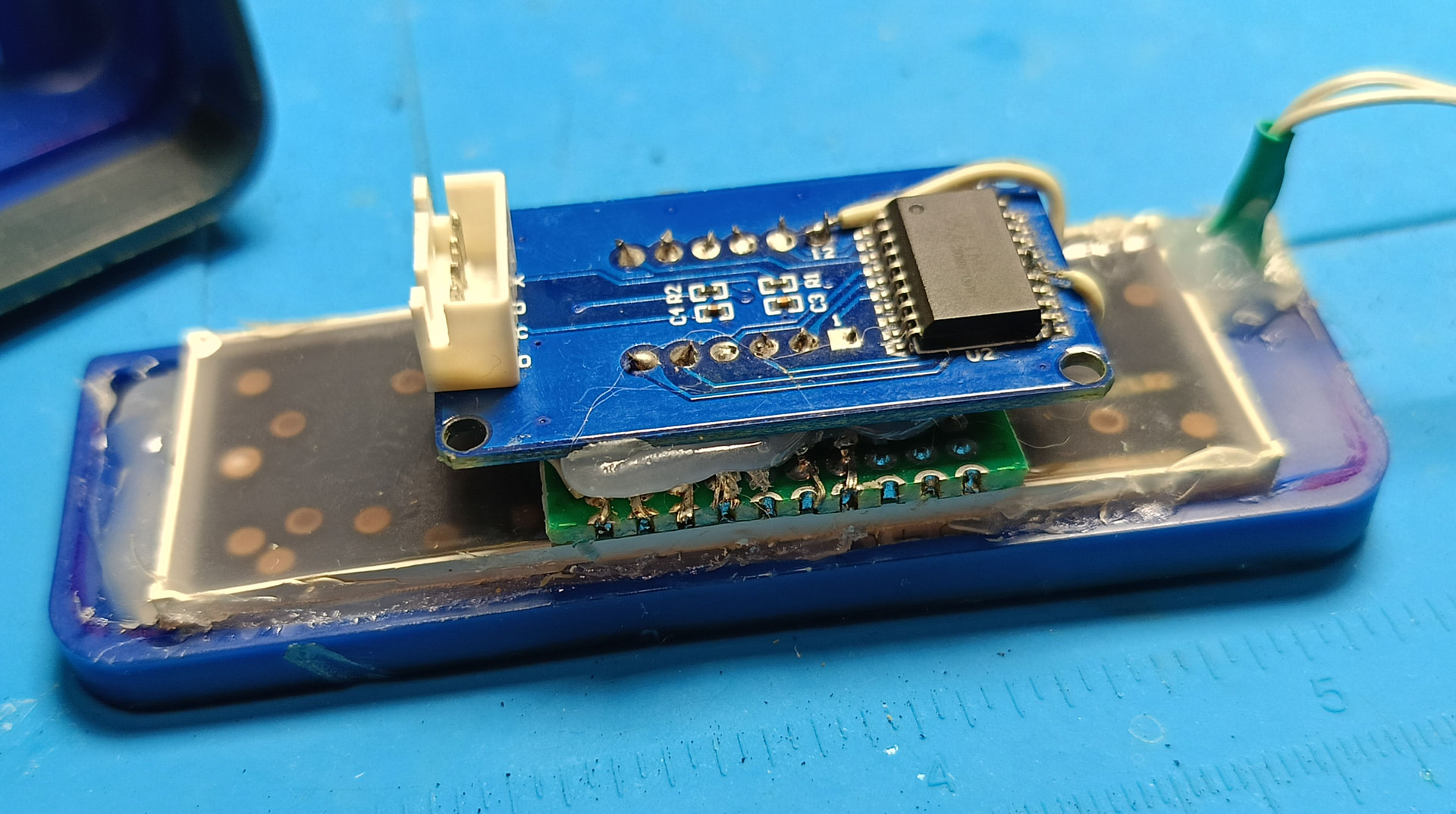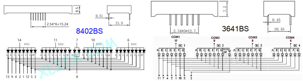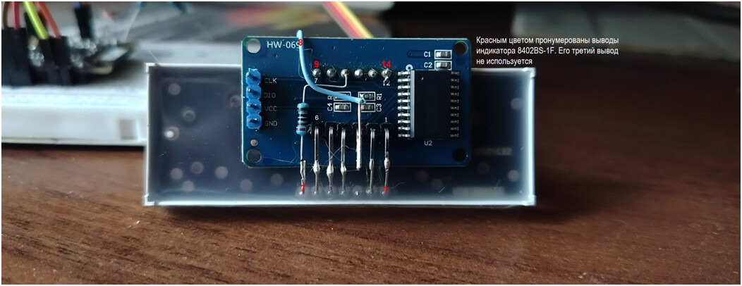 А вот существенным плюсом такого выбора стала практически одинаковая цоколевка индикаторов, позволившая напаять замену прямо на плату ТМ1637, с которой предварительно был выпаян родной индикатор. Правда у большего индикатора 14 пинов, а у малого 12, но их чередование совпадает, кроме последней пары 7-8 у 8402BS-1F, на которую выведены светодиоды двоеточия, полностью независимые от внутренней схемы индикатора. Эта пара выводов при пайке отгибается в сторону и потом соединяется с платой отдельными проводками.