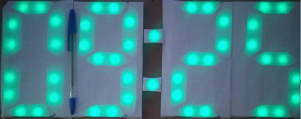 Сначала в отверстиях платы пропаиваются выводы 9-14, затем к гребенке напрямую «мостиком» паяются выводы 1-6 и, наконец, выводы «двоеточия»7-8 поверх платы навесным монтажом. Обращаю внимание на то, что двоеточие подключается через резистор 220 ом, светодиоды в нем соединены параллельно и при подаче излишнего напряжения быстро перегорают. Убедился в этом на своем опыте, уже «поджарив» один такой индикатор. В результате подобных манипуляций получаем готовый индикаторный блок, копию ТМ1637, но с индикаторами большего размера.