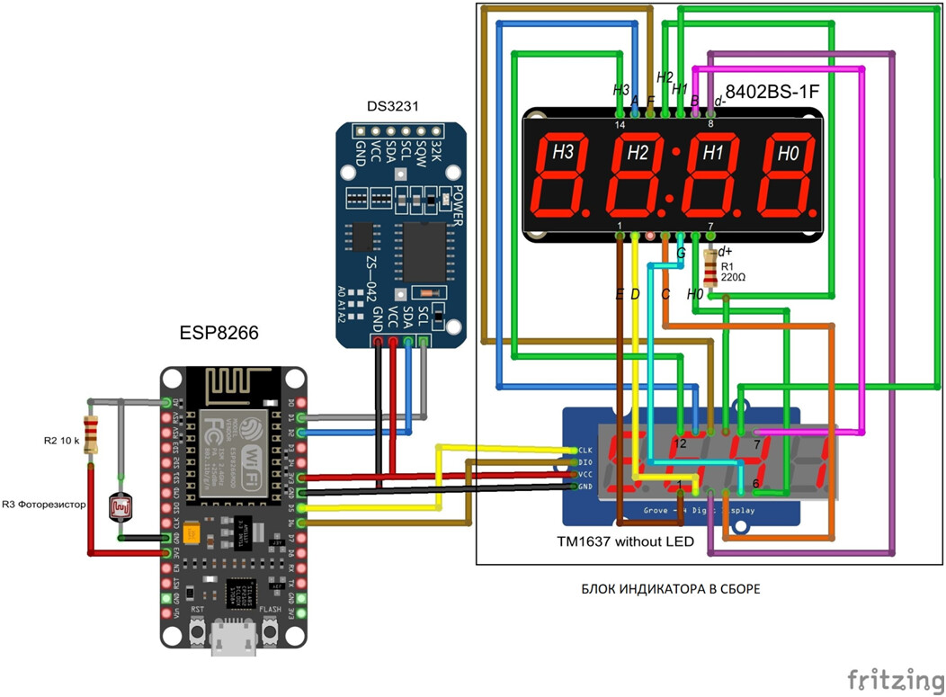 Сразу оговорюсь, что скетч не мой, а найден на сайте Github, вот ссылка для желающих его испробовать https://github.com/jvanshika2603/smart_IoT_clock/tree/main . Правда к скетчу схема часов не прилагается, но я привожу свою макетную, где для наглядности показаны соединения нового индикатора с платой ТМ1637. Скетч полностью работоспособен и компилируется с пол-оборота, за что респект его автору.