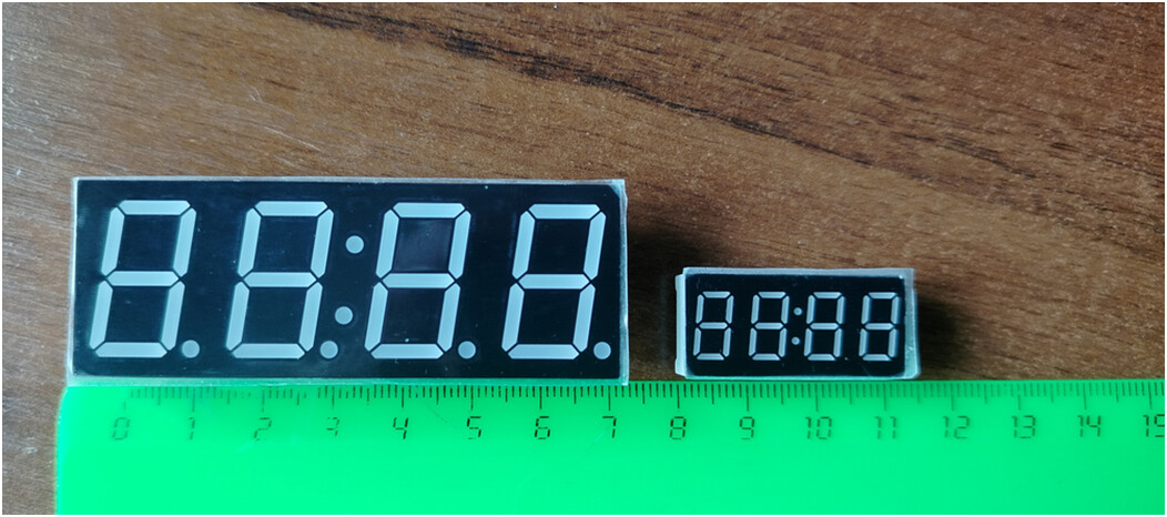 Для меня было заманчиво попробовать заменить индикатор на плате на более крупный, используя все преимущества микросхемы ТМ1637. Следует отметить, что питание модуля осуществляется напряжением 3.3 в. Хотя, по паспортным данным напряжение питания лежит в диапазоне 3.3-5.5 в, питание модуля напряжением 5 в приводит к паразитной засветке сегментов и полной неработоспособности. Искать замену индикатора пришлось в той же номенклатуре низковольтных индикаторов, каким и был родной. Дискретные индикаторы от 1 дюйма и выше не годятся, так как требуют питания от 5.8 до 9в. У них каждый сегмент состоит из 2-4 последовательно соединенных светодиодов. Мой выбор остановился на индикаторе 0.84 дюйма 8402BS-1F с общим анодом (https://aliexpress.ru/item/1005001923228159.html). Существенная разница в размерах индикаторов видна на следующем фото.