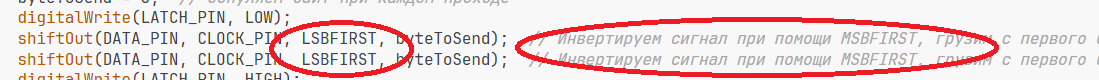 ``` #define LATCH_PIN 12 #define CLOCK_PIN 13 #define DATA_PIN 14 #define OE_PIN 5 void HC595Init() { pinMode(DATA_PIN, OUTPUT); pinMode(CLOCK_PIN, OUTPUT); pinMode(LATCH_PIN, OUTPUT); pinMode(OE_PIN, OUTPUT); digitalWrite(OE_PIN, HIGH); digitalWrite(DATA_PIN, LOW); digitalWrite(CLOCK_PIN, LOW); digitalWrite(LATCH_PIN, LOW); } void setup() { HC595Init(); // put your setup code here, to run once: } void loop() { byte byteToSend = 0; //Создаем пустой байт B00000000 for (int bitPos = 0; bitPos < 8; bitPos++) { // В переменной хранится позиция изменяемого бита byteToSend = 0; // Обнуляем байт при каждом проходе bitWrite(byteToSend, bitPos, HIGH); // При bitPos=0 получим B00000001, при bitPos=1 - B00000010, при bitPos=2 - B00000100 и т.д. digitalWrite(LATCH_PIN, LOW); // Открыли регистр shiftOut(DATA_PIN, CLOCK_PIN, MSBFIRST, byteToSend); // передаем последовательно на dataPin - в первом регистре значение B01001100 shiftOut(DATA_PIN, CLOCK_PIN, LSBFIRST, byteToSend); // Инвертируем сигнал при помощи MSBFIRST, грузим с первого бита digitalWrite(LATCH_PIN, HIGH); /// Закрываем регистр тем самым передаем значение на выводы delay(150); } byteToSend = 0; // Обнуляем байт при каждом проходе digitalWrite(LATCH_PIN, LOW); shiftOut(DATA_PIN, CLOCK_PIN, LSBFIRST, byteToSend); // Инвертируем сигнал при помощи MSBFIRST, грузим с первого бита shiftOut(DATA_PIN, CLOCK_PIN, LSBFIRST, byteToSend); // Инвертируем сигнал при помощи MSBFIRST, грузим с первого бита digitalWrite(LATCH_PIN, HIGH); delay(150); for (int bitPos = 0; bitPos < 8; bitPos++) { // В переменной хранится позиция изменяемого бита byteToSend = 0; // Обнуляем байт при каждом проходе bitWrite(byteToSend, bitPos, HIGH); // При bitPos=0 получим B00000001, при bitPos=1 - B00000010, при bitPos=2 - B00000100 и т.д. digitalWrite(LATCH_PIN, LOW); // Открыли регистр shiftOut(DATA_PIN, CLOCK_PIN, LSBFIRST, byteToSend); // передаем последовательно на dataPin - в первом регистре значение B01001100 shiftOut(DATA_PIN, CLOCK_PIN, MSBFIRST, byteToSend); // Инвертируем сигнал при помощи MSBFIRST, грузим с первого бита digitalWrite(LATCH_PIN, HIGH); /// Закрываем регистр тем самым передаем значение на выводы delay(150); } byteToSend = 0; // Обнуляем байт при каждом проходе digitalWrite(LATCH_PIN, LOW); shiftOut(DATA_PIN, CLOCK_PIN, LSBFIRST, byteToSend); // Инвертируем сигнал при помощи MSBFIRST, грузим с первого бита shiftOut(DATA_PIN, CLOCK_PIN, LSBFIRST, byteToSend); // Инвертируем сигнал при помощи MSBFIRST, грузим с первого бита digitalWrite(LATCH_PIN, HIGH); delay(150); // Включение всех светодиодов } ```