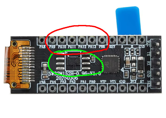 Сам контроллер (у меня стоит с надписями pd32s h5h6 hc4, непонятно что за контроллер) тут стоит на месте площадки отмеченной зелёным цветом, и подразумевается, что можно на его место припаять какой ни будь навроде attiny.