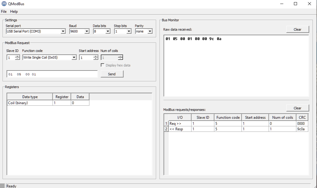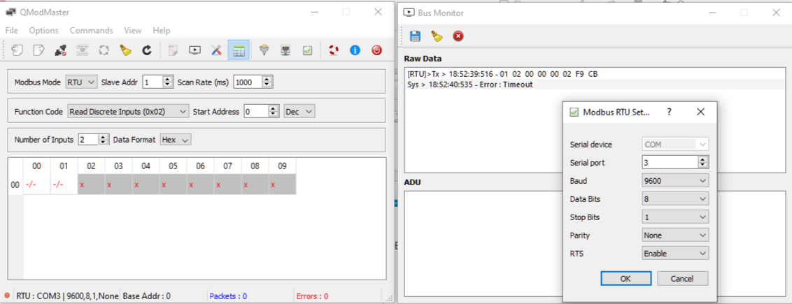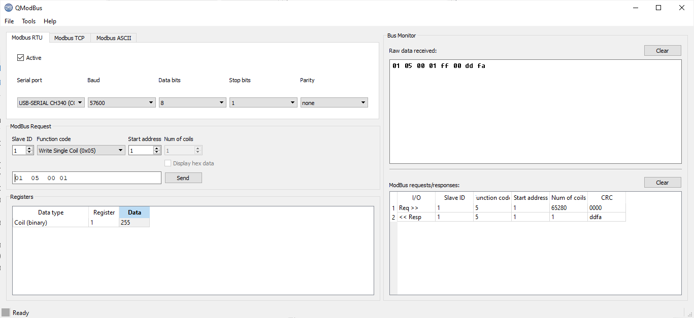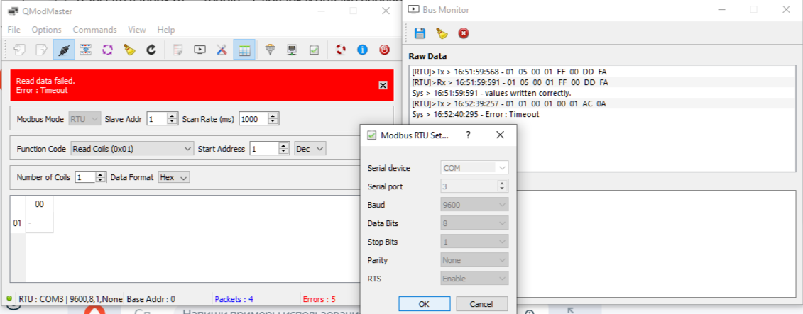 Nic, привет. Посмотрел версию Qmodbus по твоей ссылке - мою, похоже, родили позже. Так что продолжил на своей. Как ни странно, по 5 функции (вкл 1 реле) сработало штатно - см вкладку Bus monitor. А 1 функцию (чтение сост. дискр. выходов) - не хочет, опять timeout. Скорее всего, по ф.1 китайса не понимает, что от него хотят. Полазил по Ali, посмотрел отзывы на такие блочки в других магазинах. Нашел в одном месте, что парень ругается на этот блочок - протокол Modbus у него не стандартный. Написал в чат продавцу, попросил руководство пользователя на блочок. Жду.