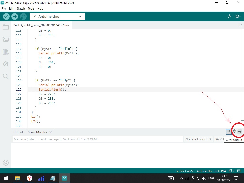 Зачем очищать монитор порта из скетча? Это же не экран, куда выведена какая-то информация. Это текстовая консоль, куда выводится все, что пришло вот конкретно сейчас. Все, что выше - просто история полученных данных. Если эти записи не нужны - жми кнопку и продолжай с чистого листа )