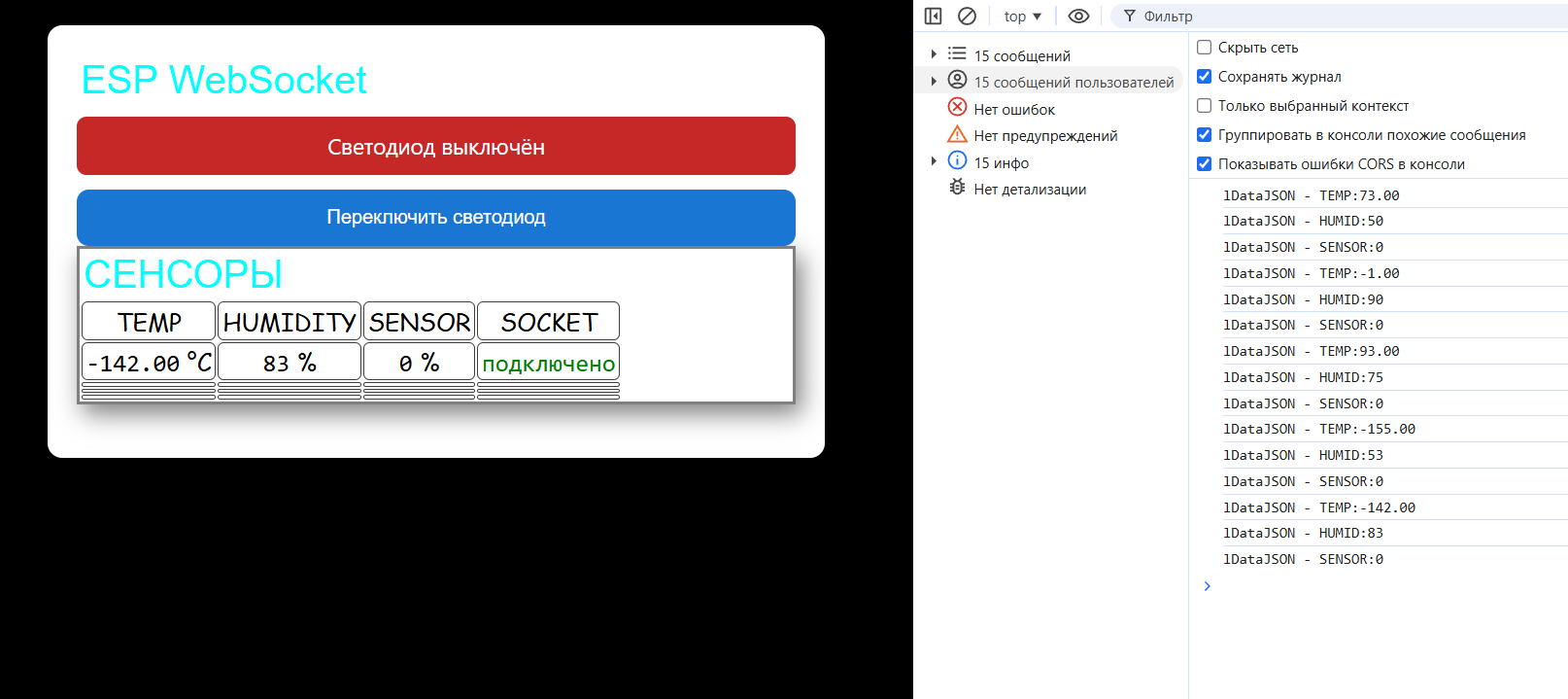 void loop() { ws.cleanupClients(); static unsigned long last = 0; if (millis() - last > 2000) { last = millis(); JsonDocument doc; // Create the "digital" array JsonArray pin = doc["pin"].to<JsonArray>(); for (int i = 0; i = 15; i++) { // cheek register СВ4021, contact with rezistors 1,5kOm uint8_t valueOfPin = sr.get(i); //read value of pin [i] on register char b = valueOfPin; pin.add(b); } serializeJson(doc, pin); } }