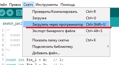 Это вы издеваетесь, не читаете что я спрашиваю, в программе Arduino у меня выбран программатор Arduino UNO, туда я скетчи заливаю и на планшетке смотрю, как отрабатывает. Этим программатором через эту программу я не шью, тут только скетчи пишу, потом компилирую в HEX, писал уже как, и уже HEX-ом через другой программатор и другую программу шью.