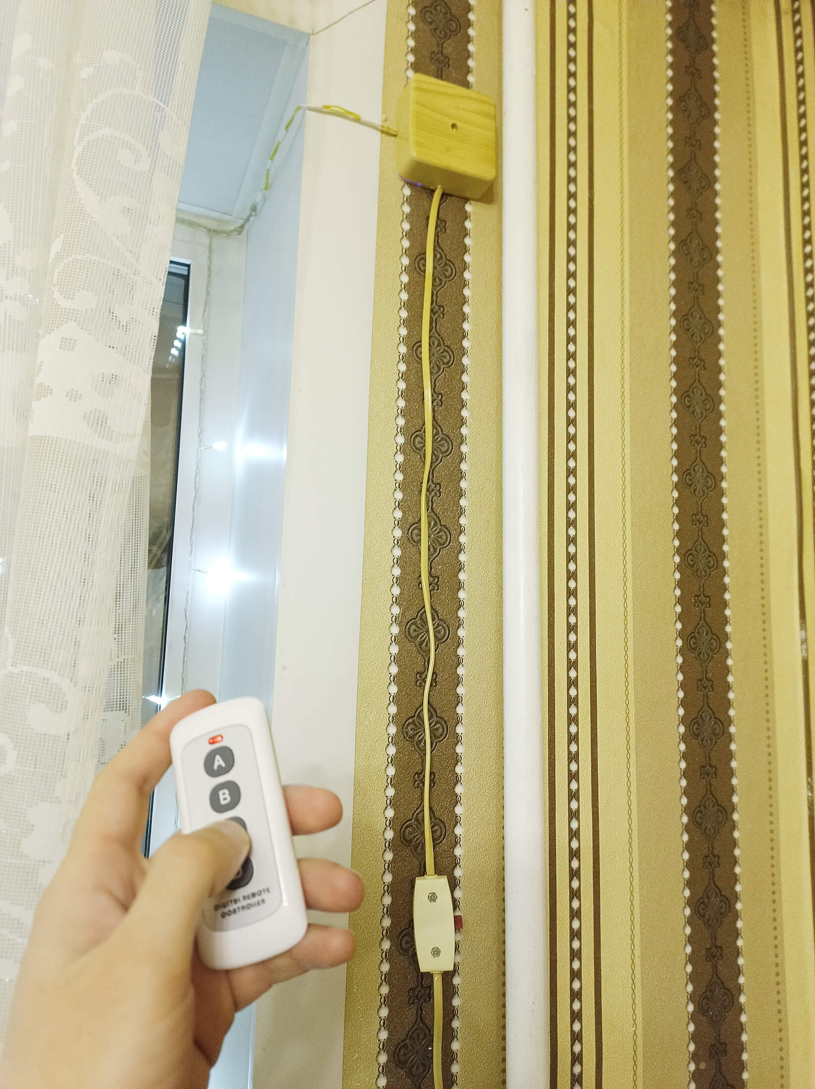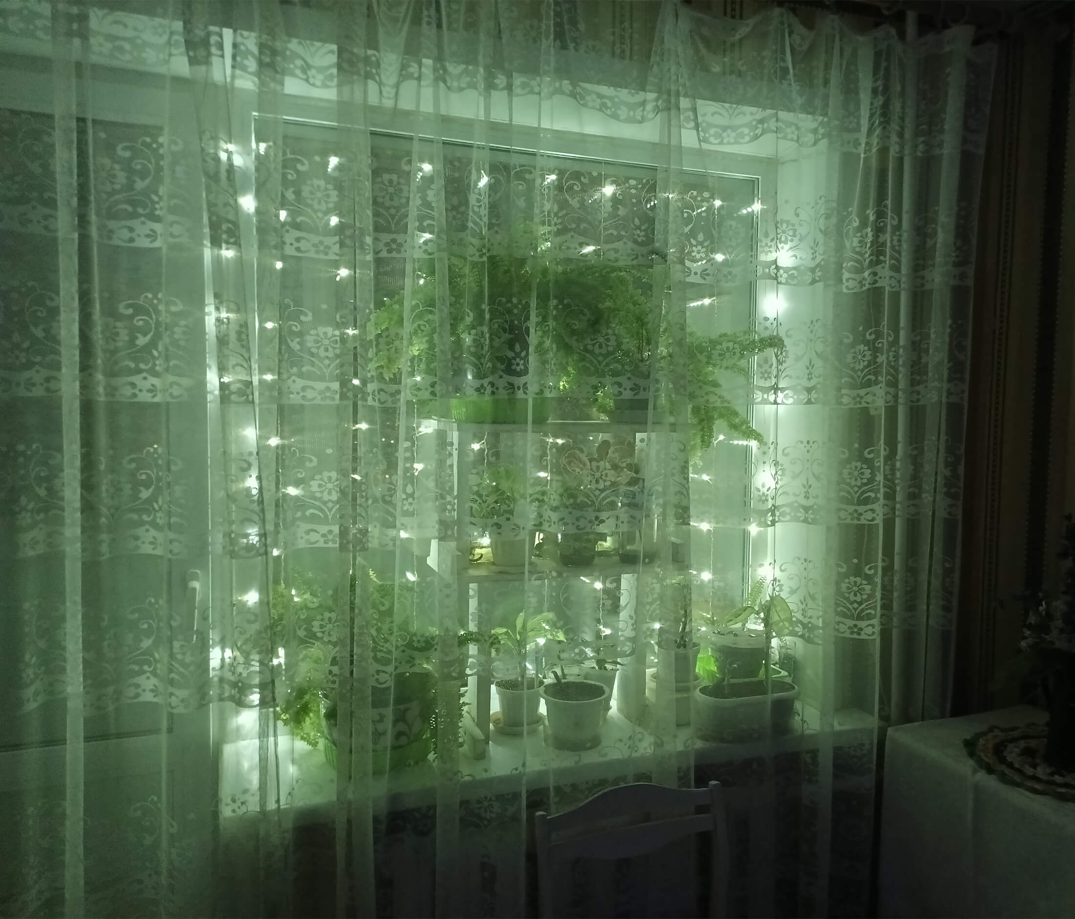 Старенькая гирлянда снова на своём рабочем месте, не раздражает миганием, включается с пульта и обеспечивает приятную подсветку.