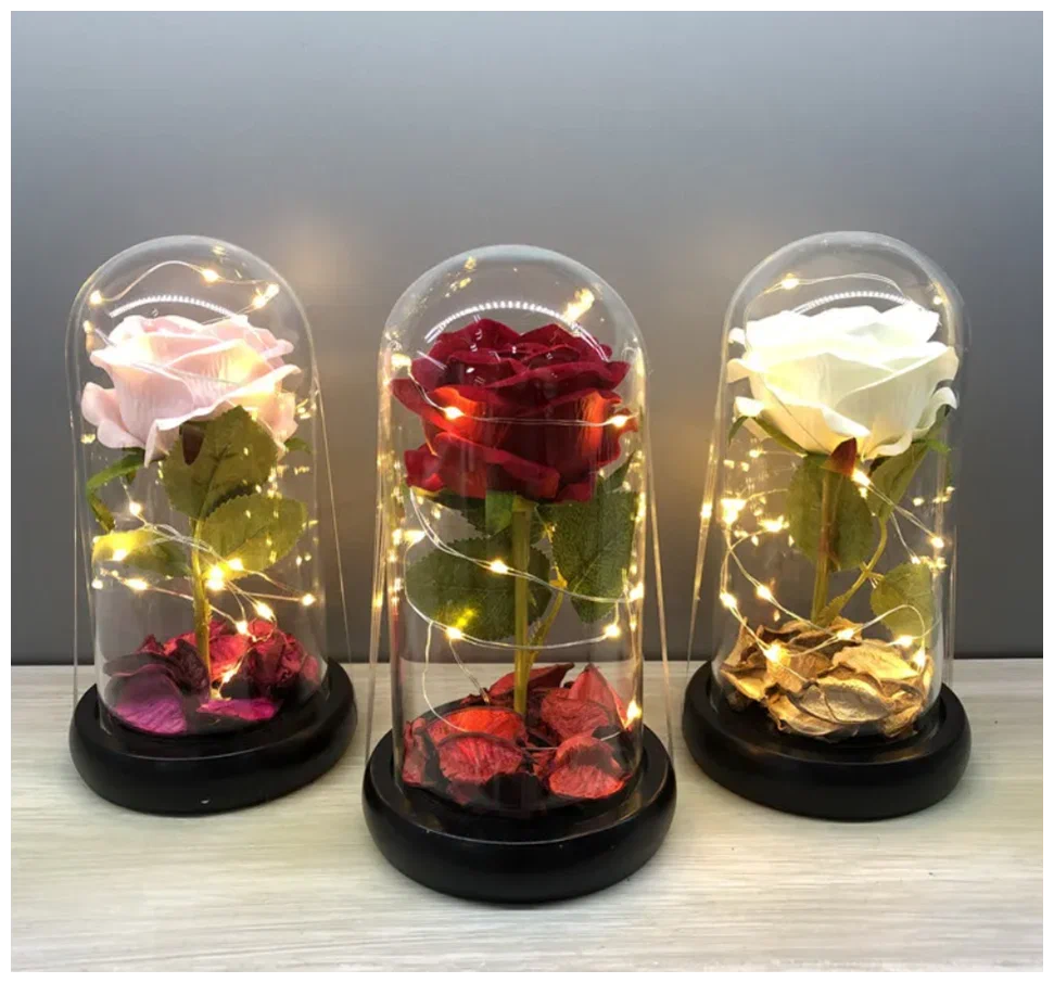 Идея такая, на просторах маркетплейсов есть подарочная колба с цветком внутри, ее вы скорее всего могли видеть в мультике от Disney “Красавица и чудовище” .