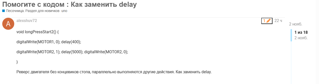 Код написан и представлен единственный недостаток что во время (delay) я не могу выполнить другие действия которыми хочу дополнить скетч: