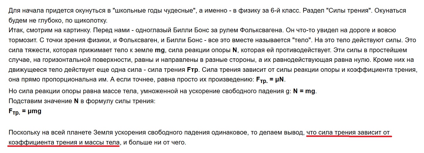 А давайте кооф трения заменим по формуле через массу - вуаля тормозной путь не зависит от кооф. трения. Визуально нет в формуле значит не зависит! Классная логика. Это я и называю
