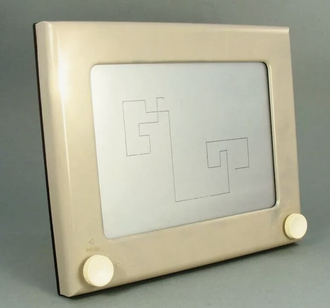 По принципу настольного футбола - две тяги крест-накрест, или пантограф-повторитель, если точно рисовать. Вниз каретку с магнитом, что-нибудь для “очистки“, типа гладилки (тоже ручной) на всю площадь, для эффекта низкую боковую подсветку (ардуинку не надо, китайская ргб-гирлянда). В любой деревне будет пользоваться популярностью, особенно в детском уголке.