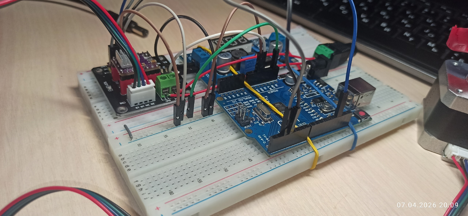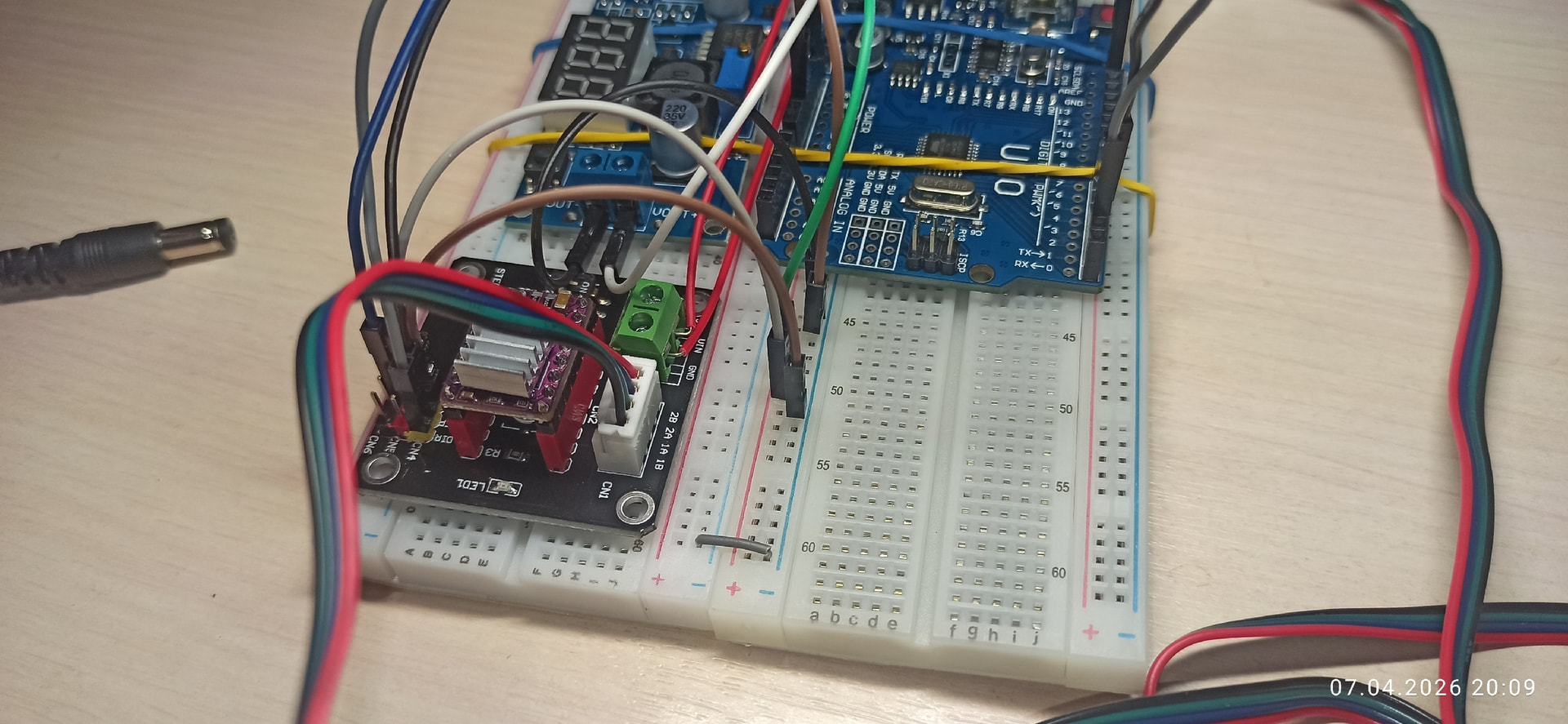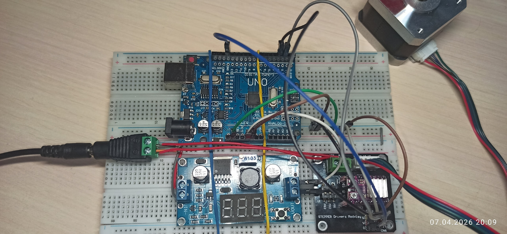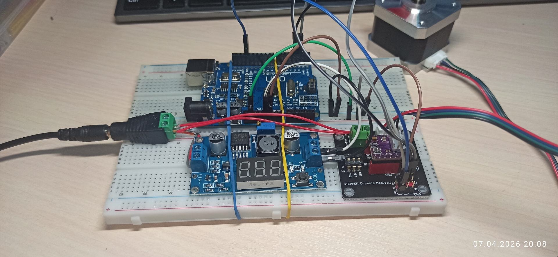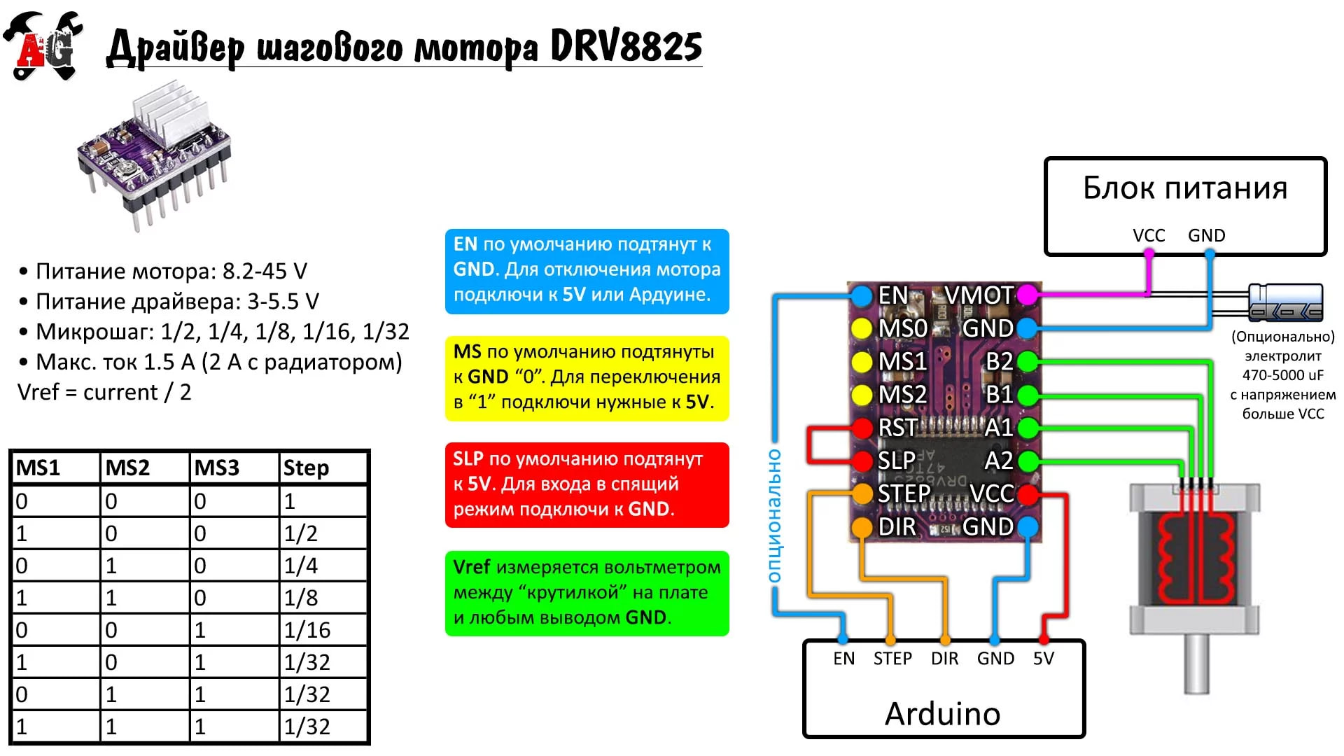 Не получается включить шаговик. Использую Arduino UNO, понижающий преобразователь напряжения / LM2596S (DC-DC) для самой ардуинки, модуль-адаптер для подключения драйверов и сам драйвер DRV8825, ну и шаговик Nema 17. На драйвер подаю напрямую 12V. GDN общий у всего. Если провод из пина D3 тыкать вручную на GDN - двигатель чуть дёргается, т.е. вроде пытается работать, а так, в пине просто издаёт какой то стрёмный скрежет/свист. Проверил пары проводов - 1А 1В, 2А 2В - это тоже подключено правильно да и провод как бы стандартный с двигателем приехал. Крутил потенциометр на драйвере: против часовой стрелки - свистит так же, против часовой стрелки - почти в конце свист полностью исчезает (похоже что просто отключается т.к. руками проворачивается). Вот тут видео и тоже эта моя тема