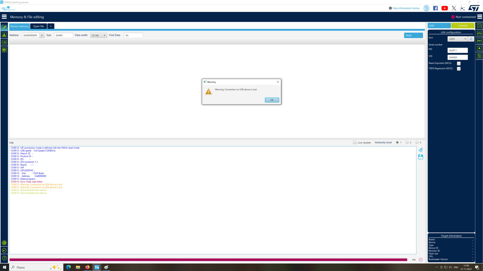 Если кнопку BOOT подключаю неправильно (вывод BOOT через резистор в 10 КОм на +3.3 в а кнопку между выводом BOOT и землей) то устройство находится но выдает ошибку стирания флеш.
