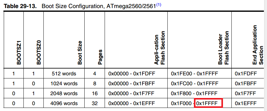 Атмега 256х использует дополнительный extended бит адреса для программирования, так как при 16 разрядно адресе можно адресовать 64к 16 битных слов, что равняется 128 Кб. Но это никак не должно влиять на процесс программирования, так как ide сама распределяет сегменты памяти.