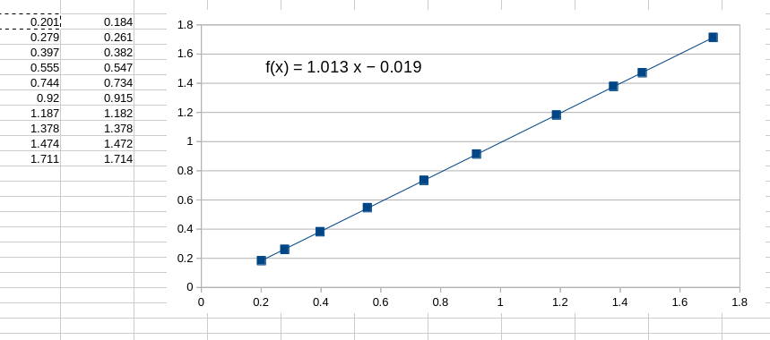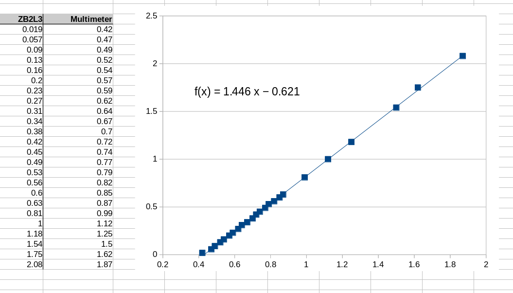 Подавая с ЛБП разные токи на вход тестера, построил табличку зависимости показываемого тока от реальных значений и нанес на график. Получилось так: