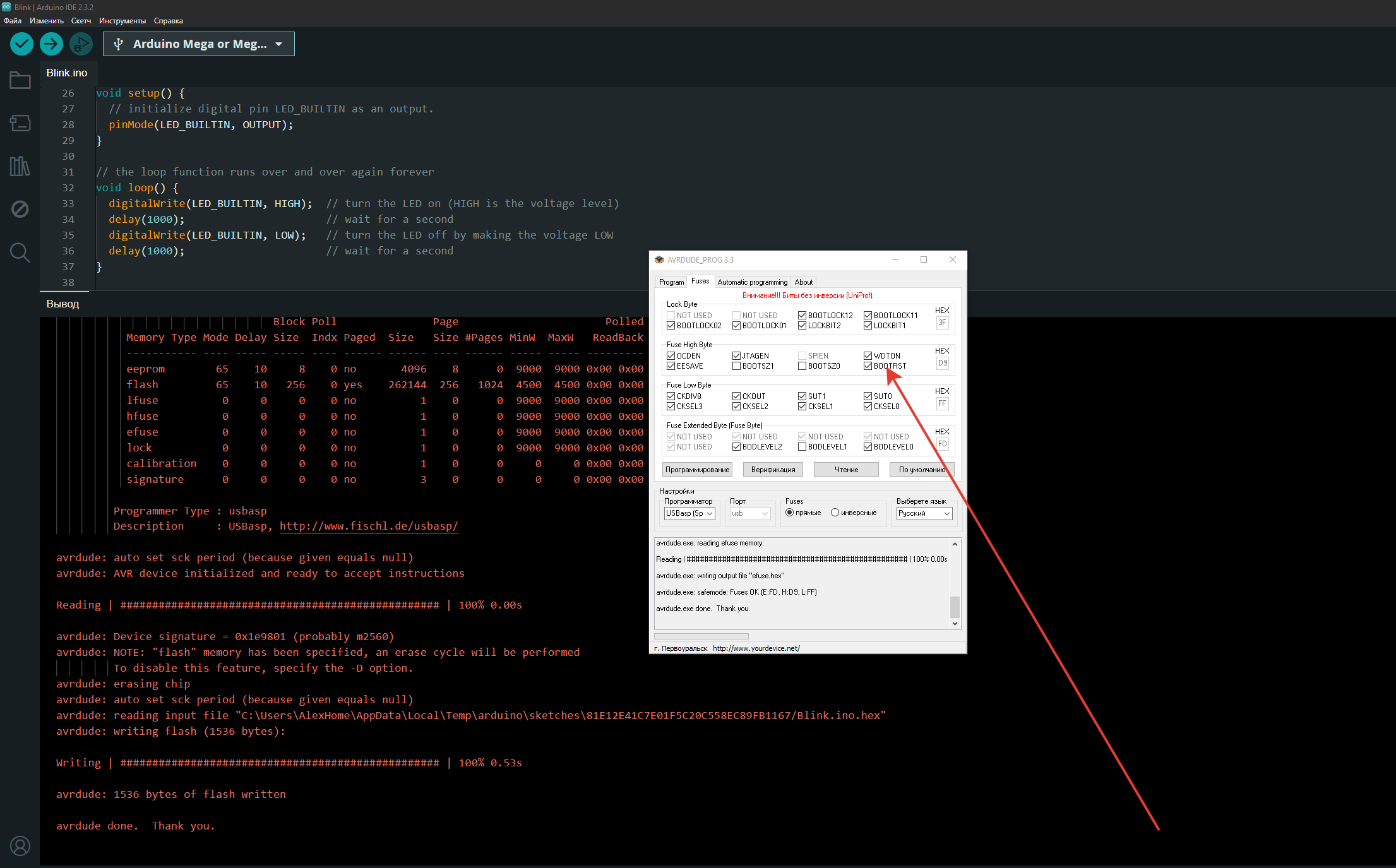 далее запускаем AVRDUDE_PROG читаем только фьюзы и там