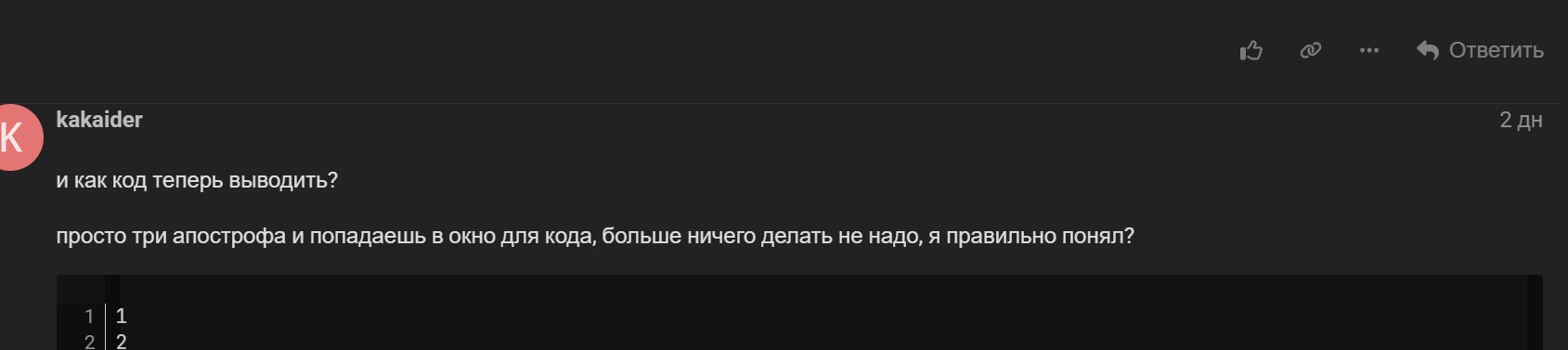 просто три апострофа и попадаешь в окно для кода, больше ничего делать не надо, я правильно понял?